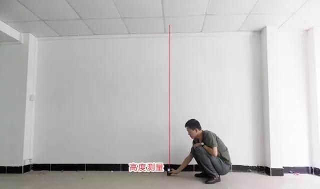 比如,你要测个墙壁的高度,你先要蹲下去,把激光测距仪放在地面上。