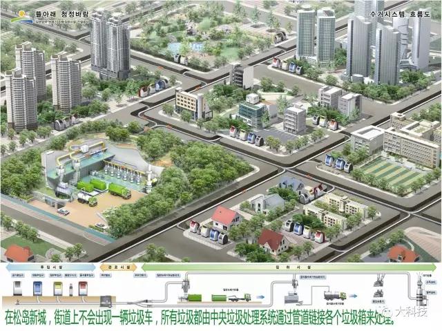 然而,松岛的智能并不止于为居民提供各种便利,而是要利用现代科技建成可持续发展、节能环保的绿色之城。松岛最著名的环保设施是垃圾处理系统。在松岛,每家每户将垃圾放至楼梯间的垃圾收集箱中,每个垃圾箱上都安装了感应器,一旦感应到垃圾箱装满了,就被吸入地下专用的垃圾管道,管道通往垃圾处理中心自动进行分类处理。废弃的食物被传送至城市公园堆肥,可循环利用的废弃物被清洗并进行再利用处理。这些管道连接至松岛的每栋建筑物。由于自动化程度非常高,目前只需要7名员工就可完成全城的垃圾收集和处理工作。