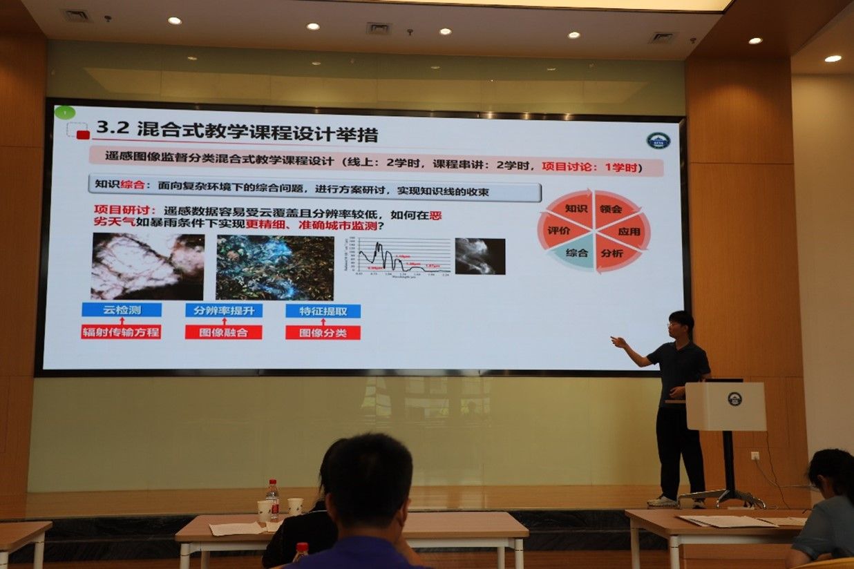 李杰老师以“项目驱动的混合进阶式教学设计”为题,从课程内容概述、教学痛点分析、教学设计举措、教学成效反馈四个方面,以“培养遥感应用人才,助力国家战略需求”为课程目标,对“遥感原理与应用”课程的线上-线下混合进阶式教学模式进行了详细汇报。精心设计的教学内容与说课视频、信息技术与课堂教学的深度协同设计、思政元素与遥感教学的有机融入方式得到了专家评委的认可。