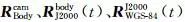 均为3×3的方阵,分别代表卫星本体坐标系到传感器坐标系、J2000坐标系到卫星本体坐标系,以及WGS-84坐标系到J2000坐标系的旋转矩阵,RBodycam通过实验室检校及在轨几何定标获得,在长时间内可认为是一个常数,RJ2000body(t)通过成像时刻t内插姿态观测四元数获得,RWGS-84J2000(t)为WGS-84坐标系到J2000坐标系的旋转矩阵;(X, Y, Z)T为像点对应地物点在物方坐标系下的坐标矢量;(XGPS, YGPS, ZGPS)T为GPS天线相位中心在WGS-84直角坐标下的坐标矢量,通过成像时刻t内插GPS观测值获得;(Dx, Dy, Dz)bodyT与(dx, dy, dz)bodyT分别为GPS的偏心矢量与投影中心的偏移矢量。