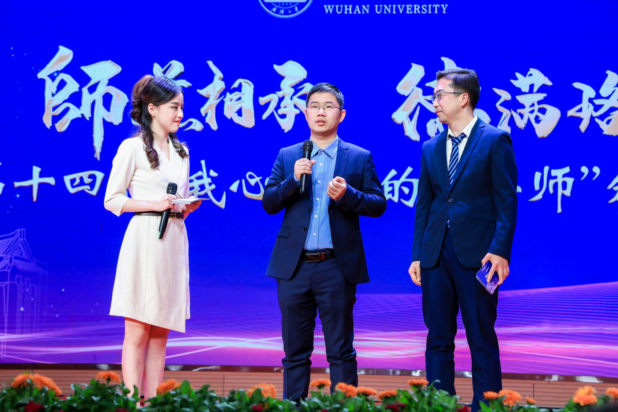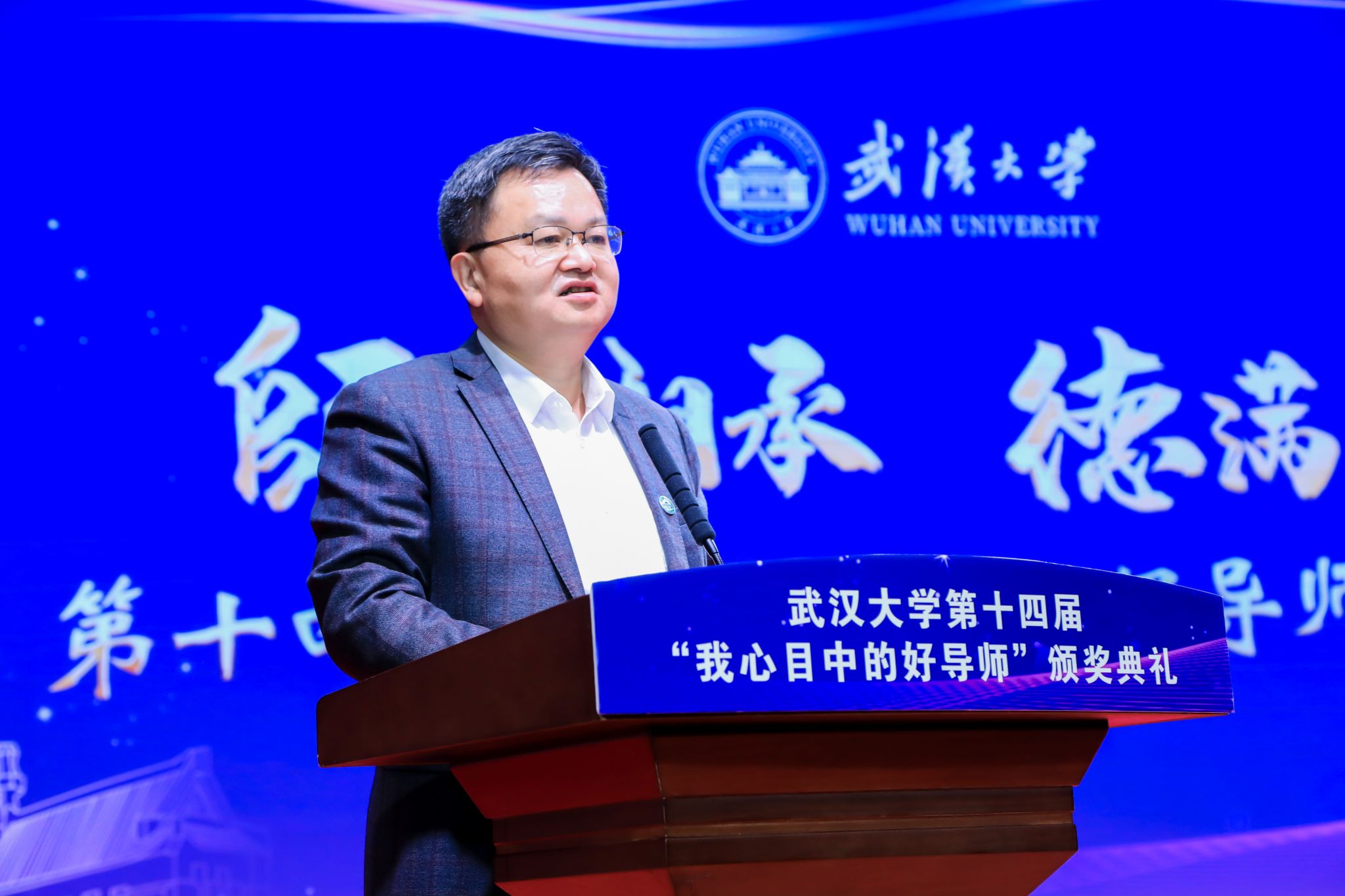 董事长张平文院士讲话,他向十位获奖导师表达了诚挚的祝贺,对好导师们在为党育人、为国育才的使命任务中接力传承给予了高度赞扬。他强调,当前全校上下正在深入学习贯彻习近平总书记重要回信精神,希望各位导师要站在新的历史方位上认真思考“中国式现代化,导师何为”“教育强国,导师何为”,勉励广大导师要胸怀“国之大者”,做强国建设的笃行者;接续砥砺奋斗,做时代新人的锻造者;练就过硬本领,做一流武大的建设者。希望广大学子传承好导师的治学精神和优良作风,自觉用国家的大事业磨砺真本领,在学术之路上追求卓越,为全面推进中国式现代化作出新的更大贡献。