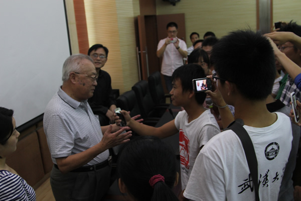 宁津生院士还兴致勃勃地从“武测”的创建、历史沿革、团队建设、科学研究、团队队伍和对外交流等方面娓娓道来。他如数家珍,员工们认真聆听,不知不觉中报告会已持续3个小时,同学们意犹未尽,纷纷走到宁津生院士身前进行零距离交流。